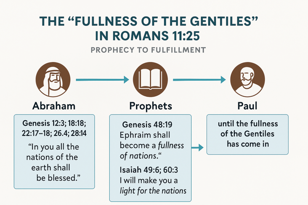 Gen 48:19 — Ephraim will become a “fullness of nations.” | plērōma tōn ethnōn = “fullness of the Gentiles.” | Paul echoes the “fullness” wording to signal a complete Gentile ingathering. |